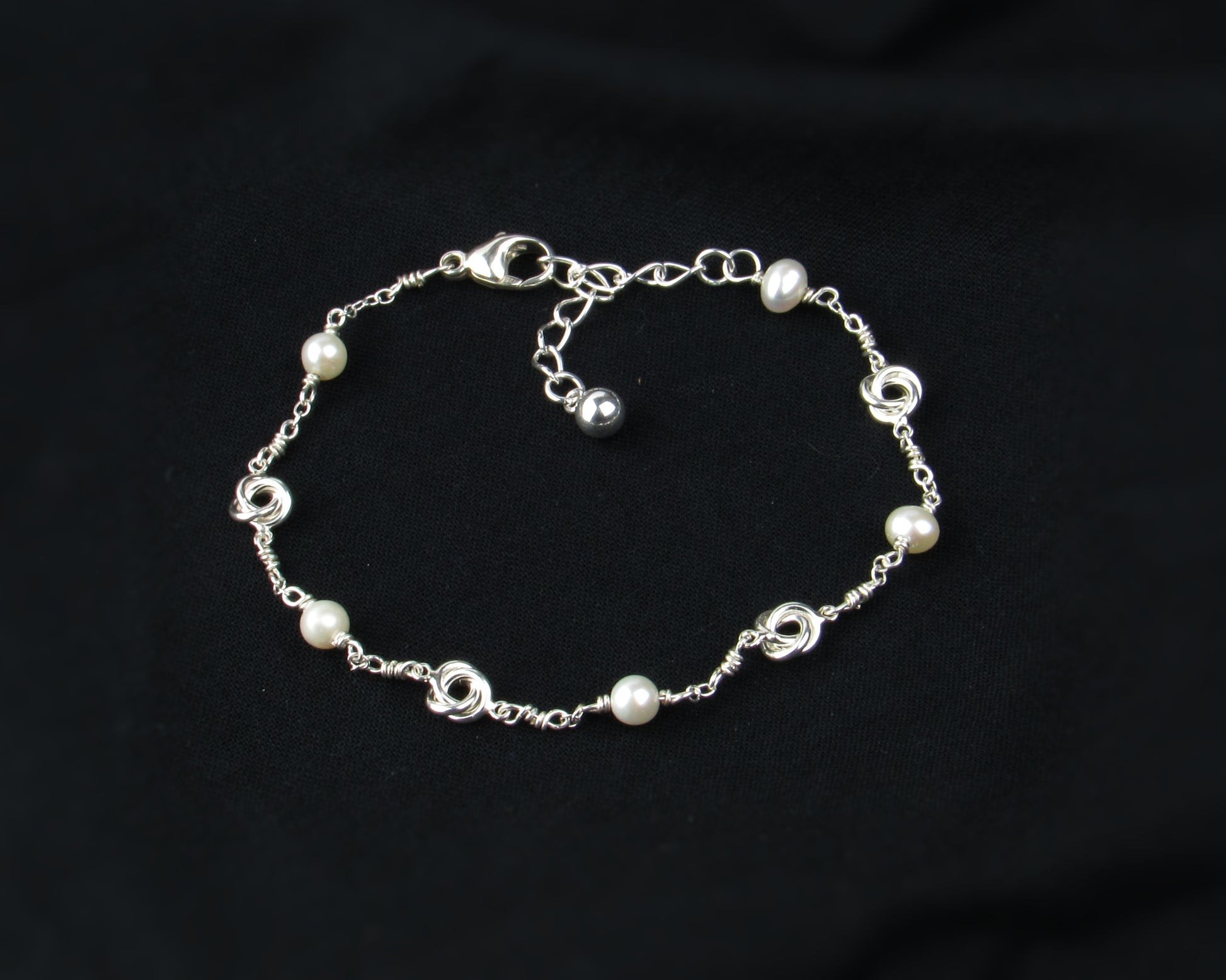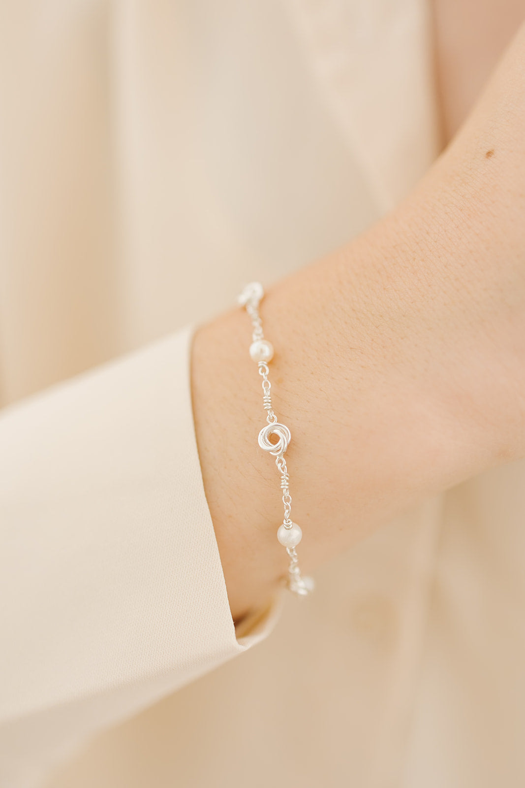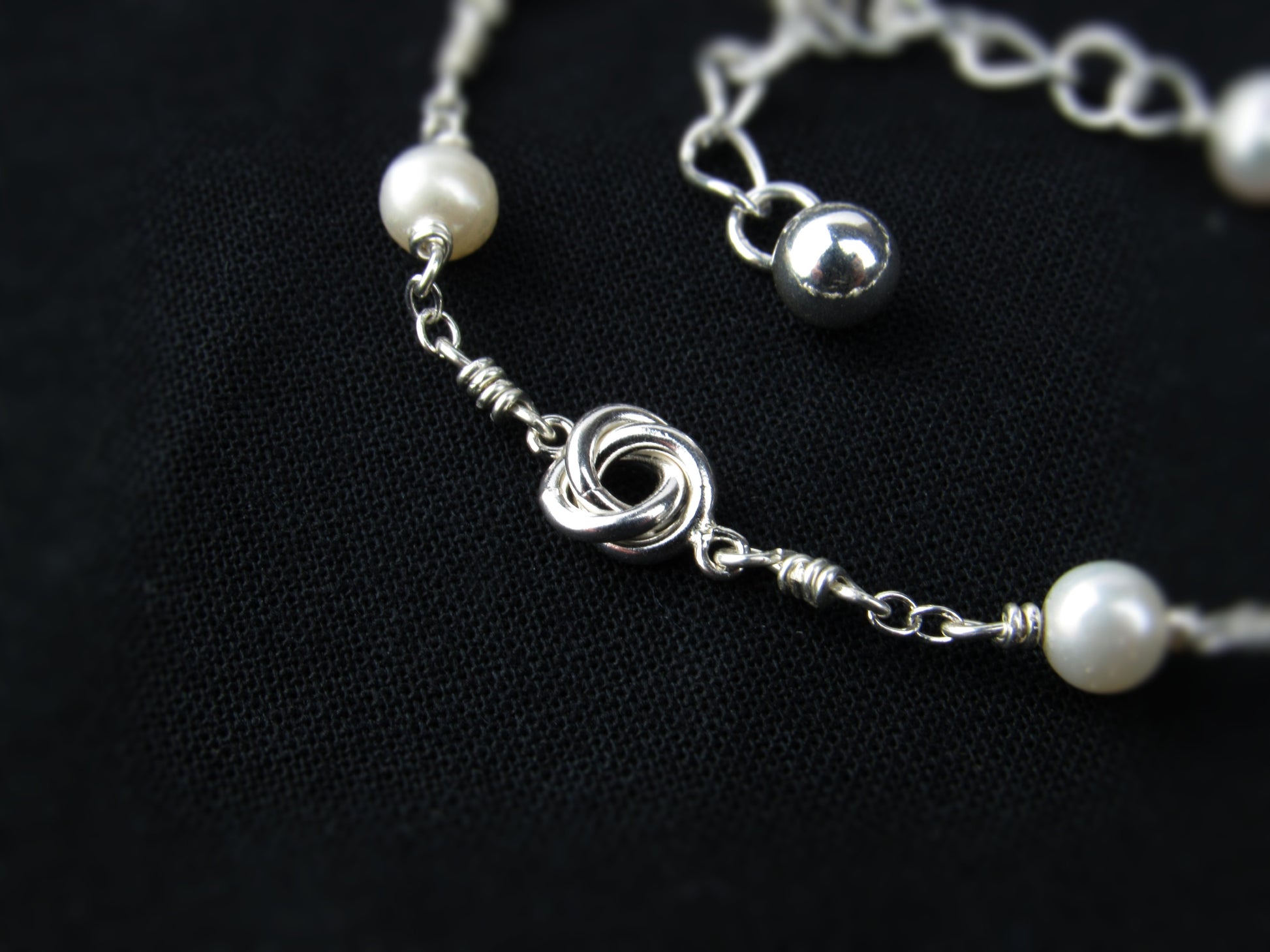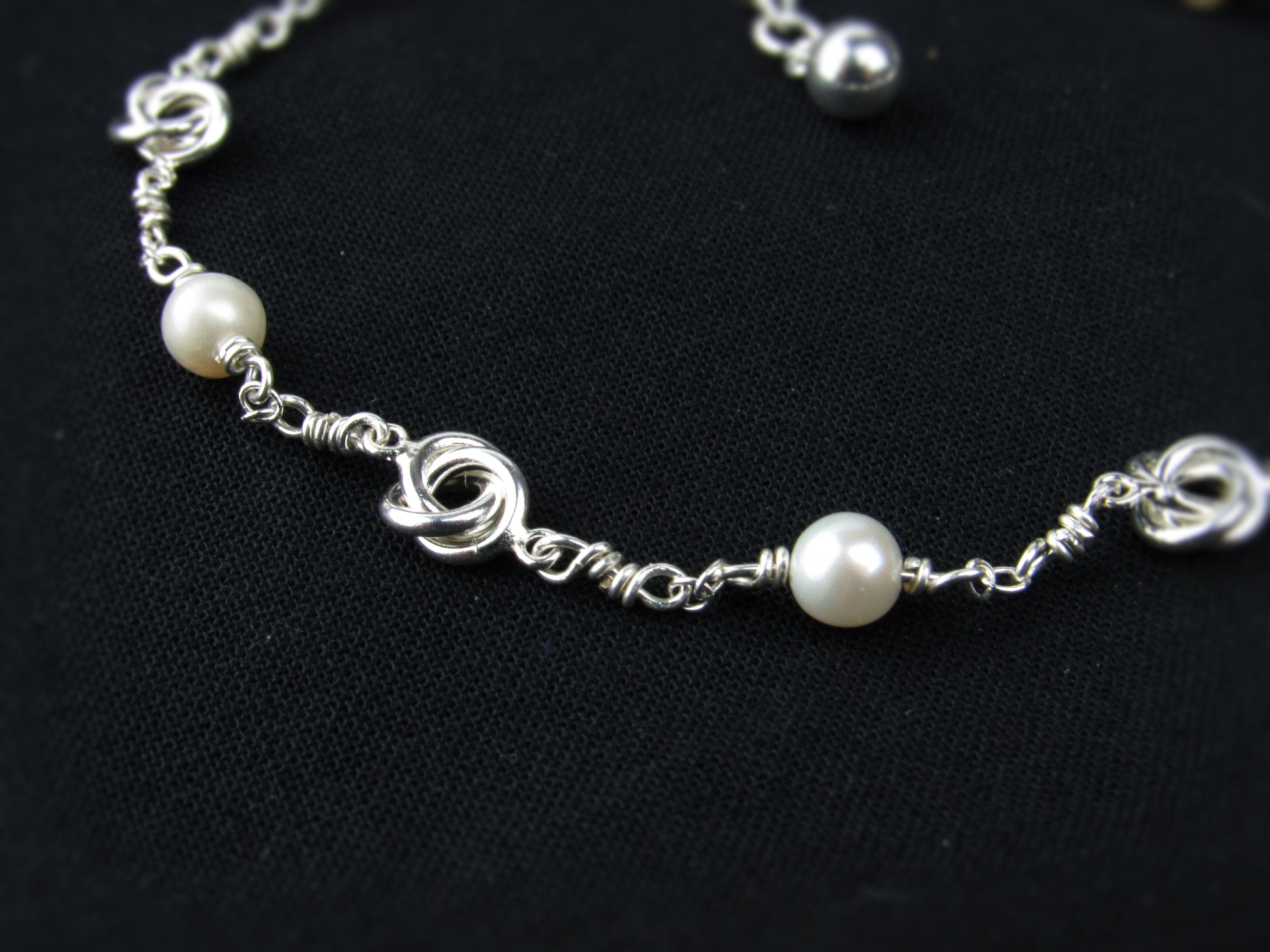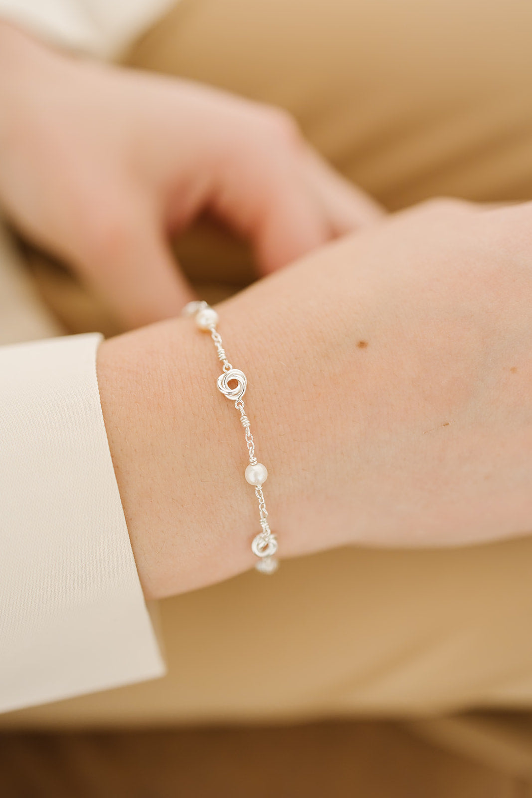 Each bead is carefully wire wrapped together in our knot pearl chain bracelet. Notice each intricate detail from the chain to the knots. This bracelet is perfect for brides or a special gift to a loved one. A quality gift and heirloom bracelet made from 100% sterling silver.