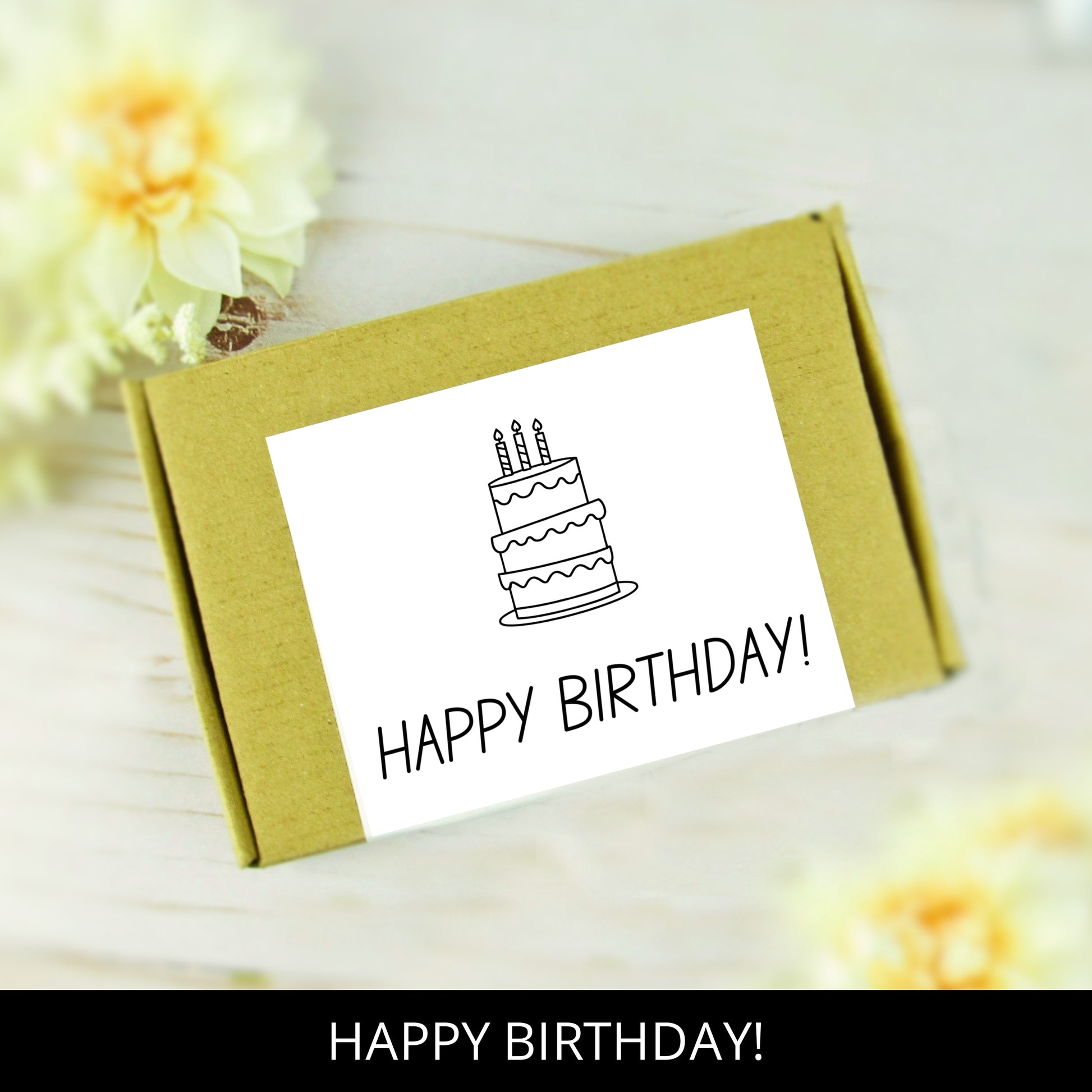 - Custom sticker on gift box with text "HAPPY BIRTHDAY!"