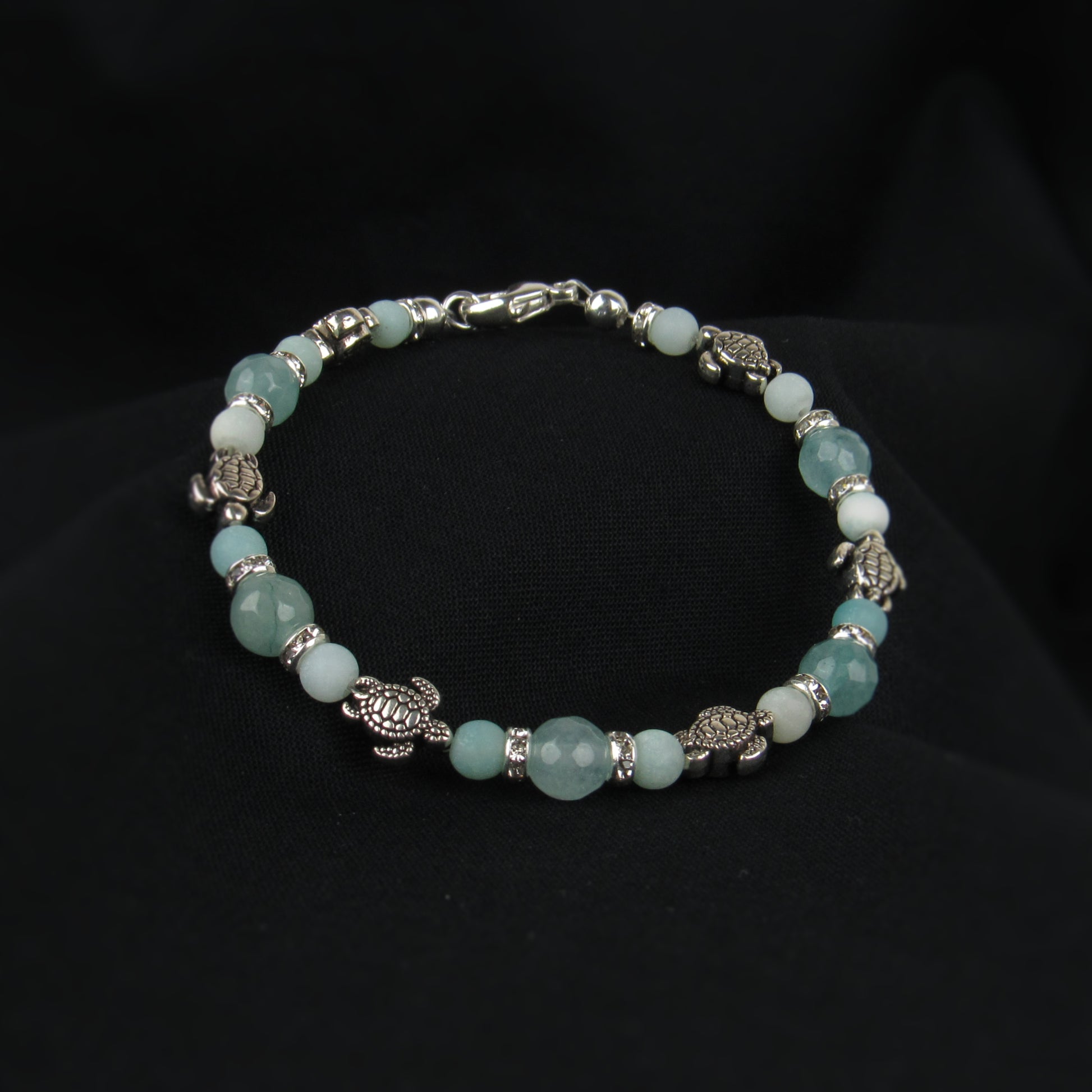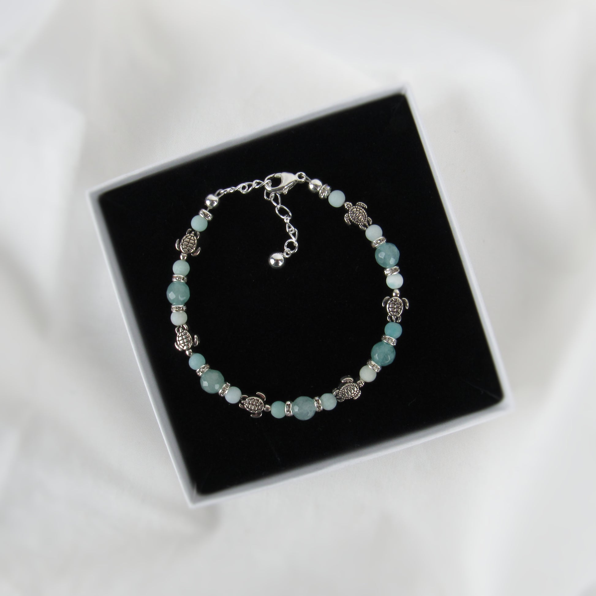 You'll love our dainty mint green sea turtle bracelet! We've paired two gemstones amazonite and quartzite for a unique design. Don't forget about the unique and detailed two-sided turtle beads! A perfect gift for turtle lovers!