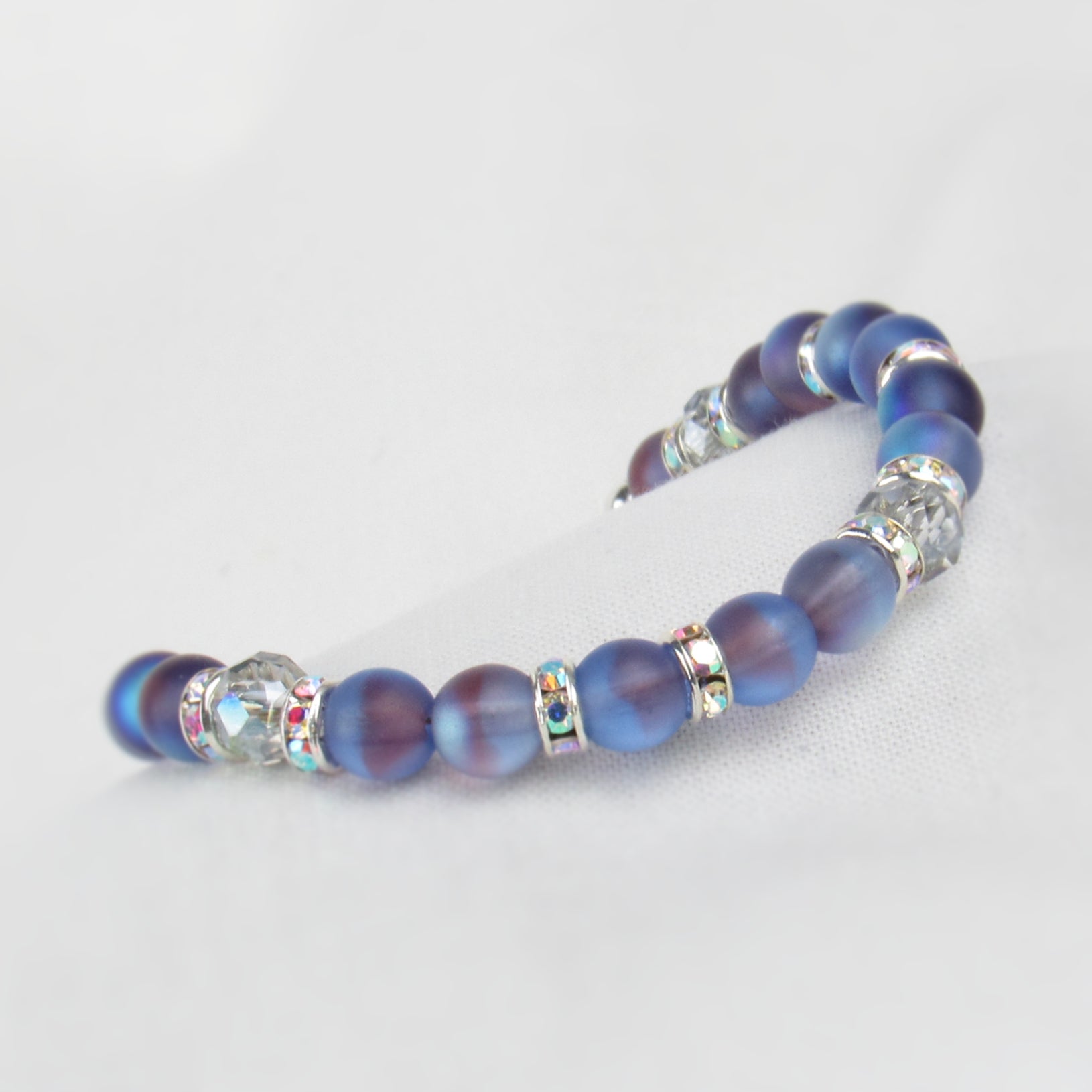 This bracelet showcases beautiful light purple beads with spots of shiny blue and yellow tones. You'll love the beautiful color and sparkle from each rhinestone spacer. A perfect piece if you're looking for something different and unique!