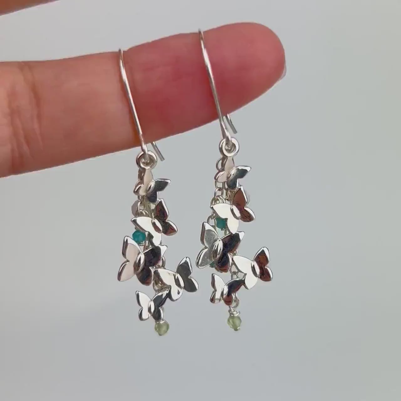 Have you ever seen earrings like these? These unique and beautiful earrings are a pair you won't want to miss. You'll love the shiny butterflies and the subtle pop of color from a hand beaded sterling chain. So unique!