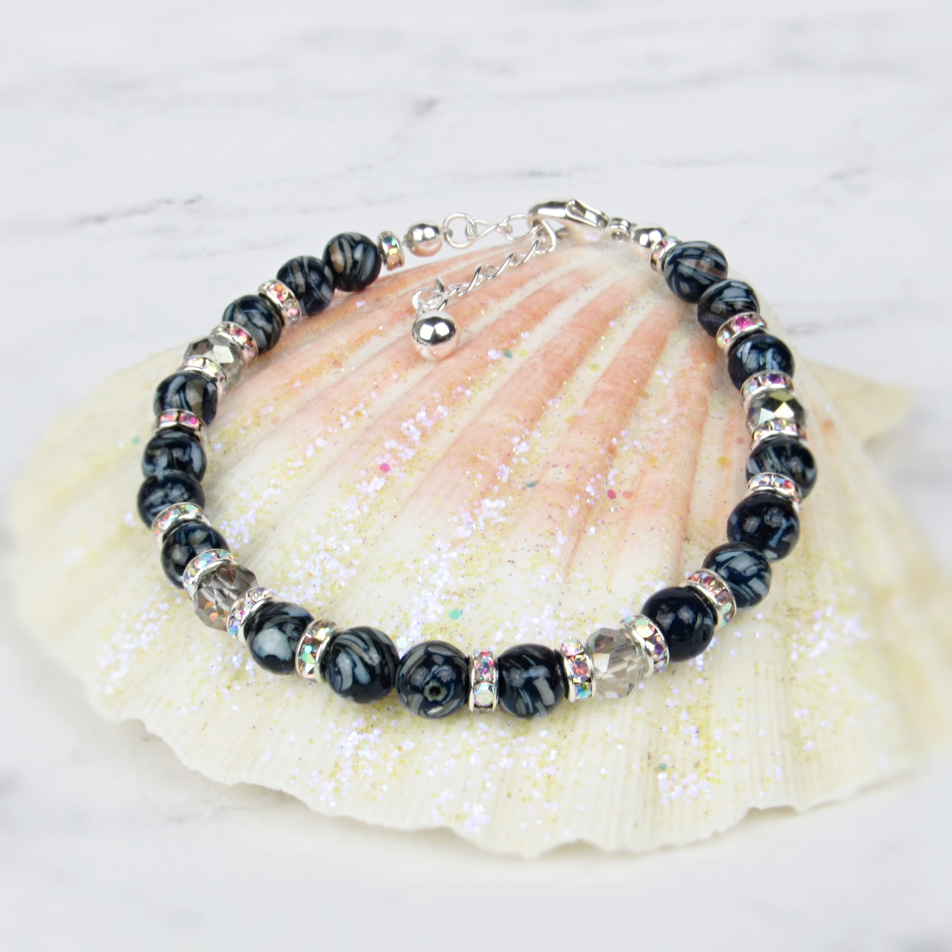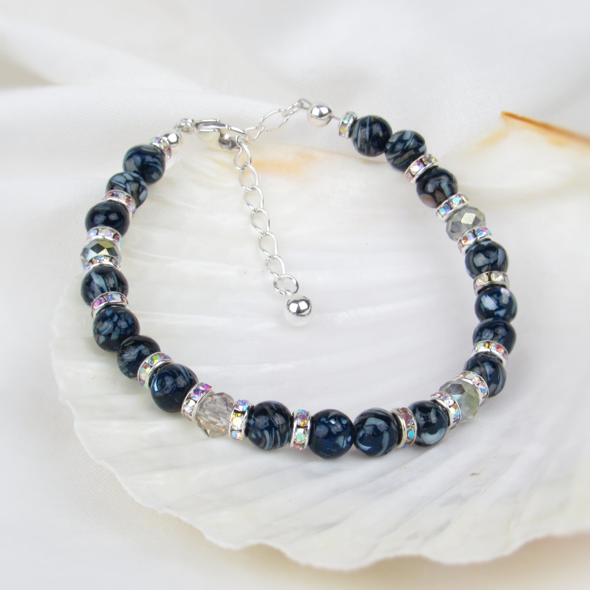 You'll love the unique navy beads in this beaded bracelet. They include speckles of dark and light shells for a unique look. We've paired this shell beads with rhinestones and glass beads for a hint of sparkle!