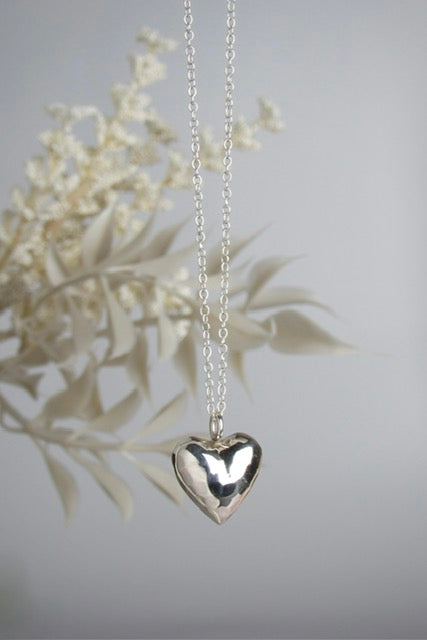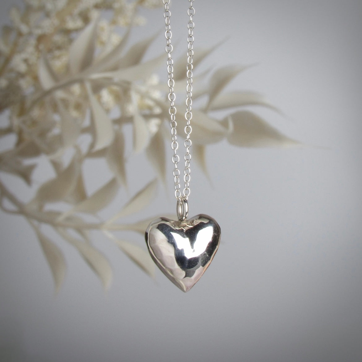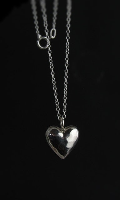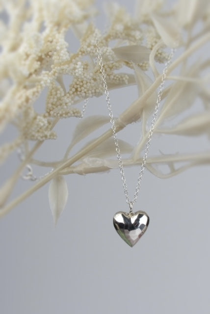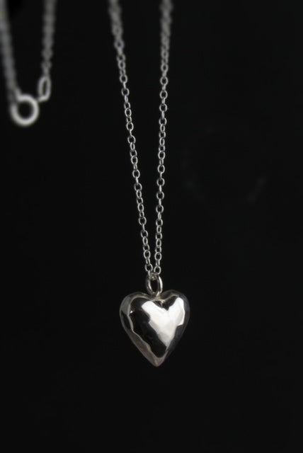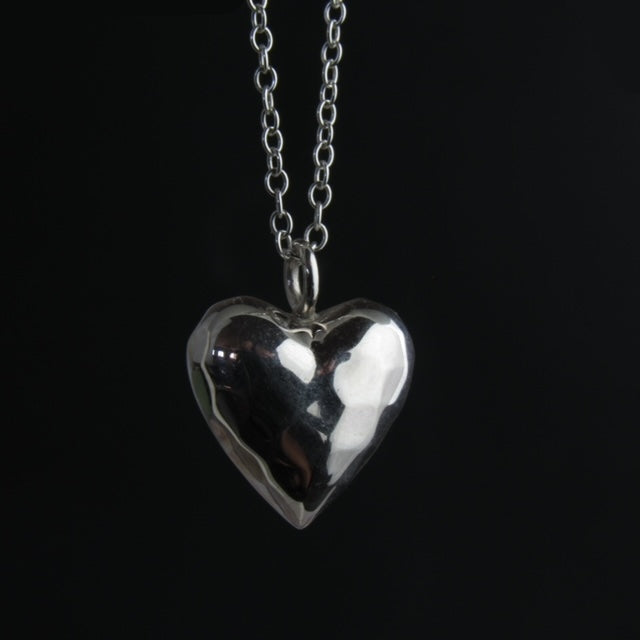 You'll adore the hammered details on our sterling puff heart pendant. The textured surface gives this pendant a beautiful shine and uniqueness. The necklace chain and pendant are sterling silver for a quality everyday piece of jewelry. Chain is 16 in.