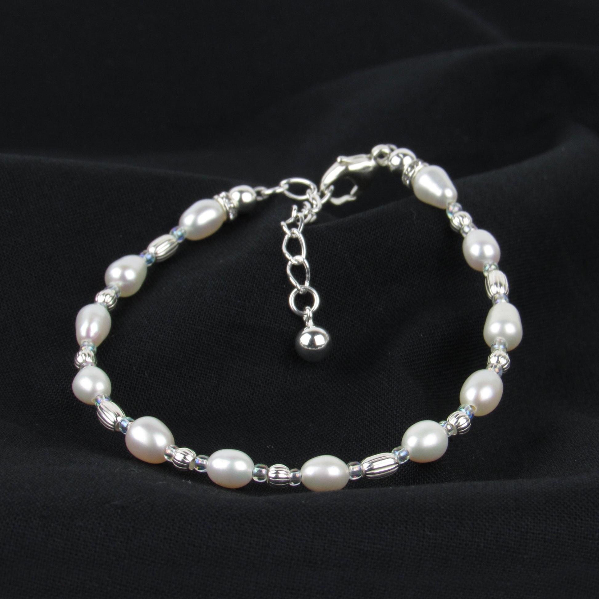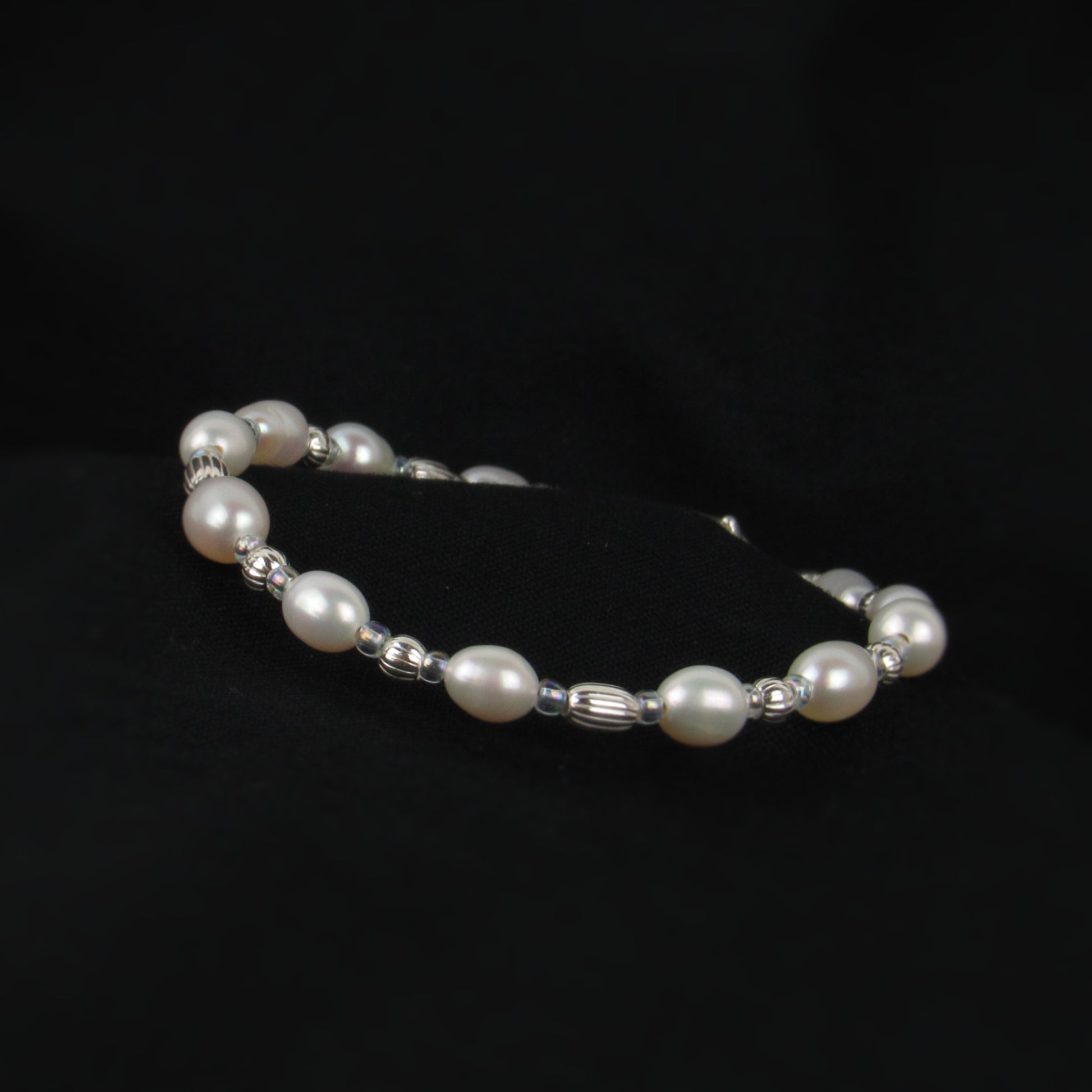 Our tiny pearl beaded bracelet is very dainty and unique. In between each pearl are detailed oval and round sterling silver beads. This bracelet is elegant and perfect for brides!