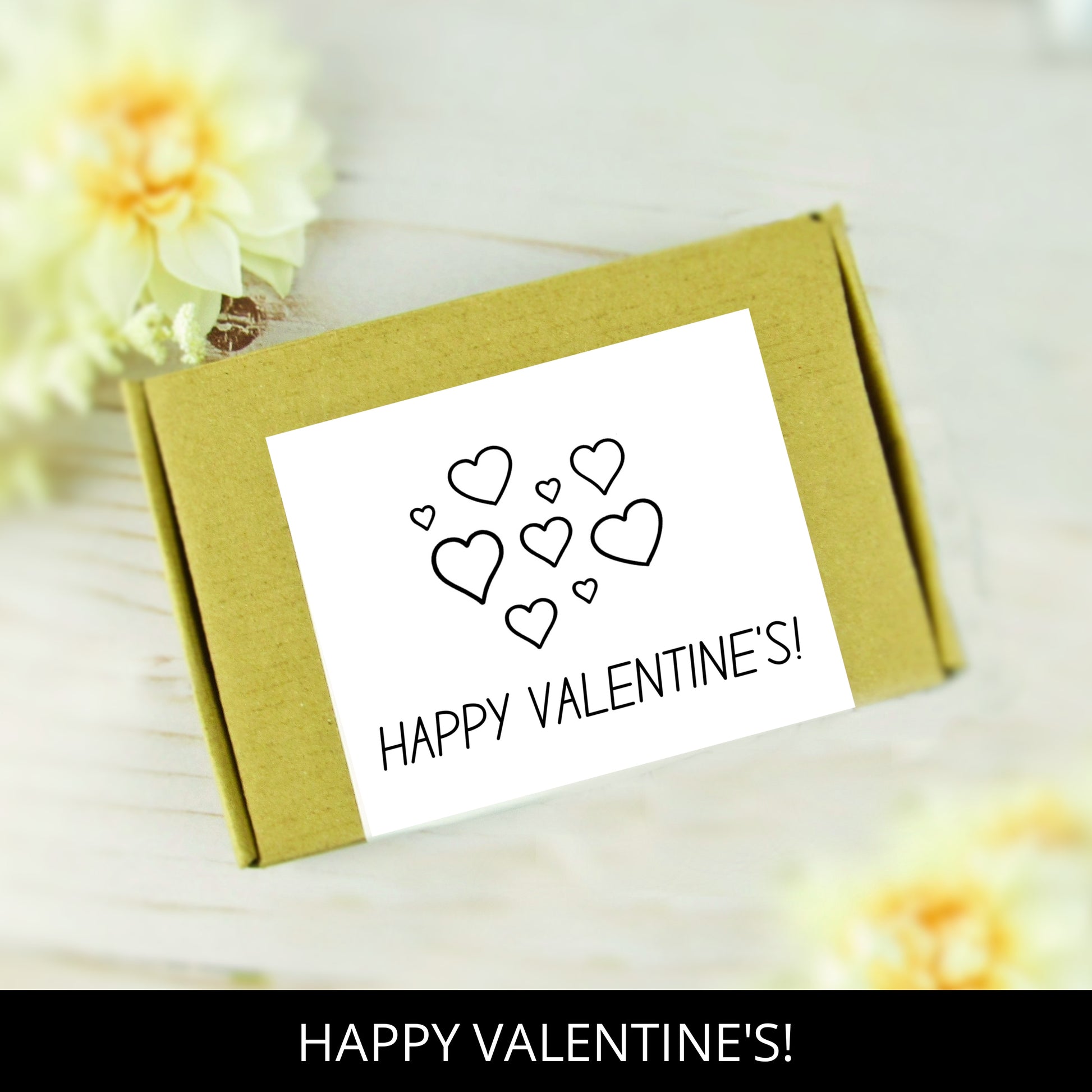 - Custom sticker on gift box with text "HAPPY VALENTINE'S"
